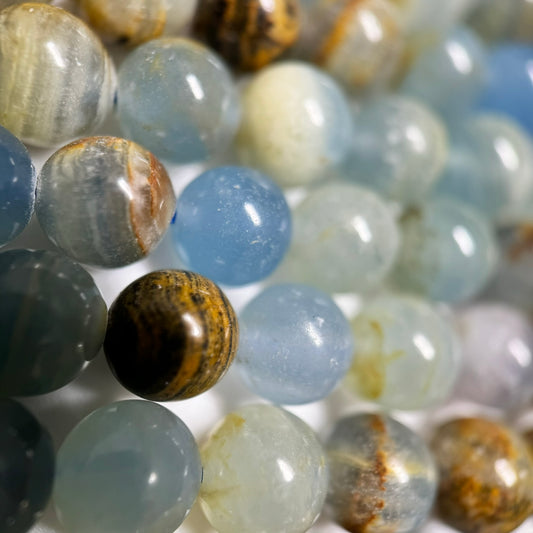 Pale blue semi-precious gemstones include pale varieties of blue topaz, aquamarine, larimar, and blue chalcedony. These stones are known for their gentle, calming energies, helping with emotional healing and relaxation. Their subtle blue tones make them ideal for understated jewelry that radiates tranquility and grace.