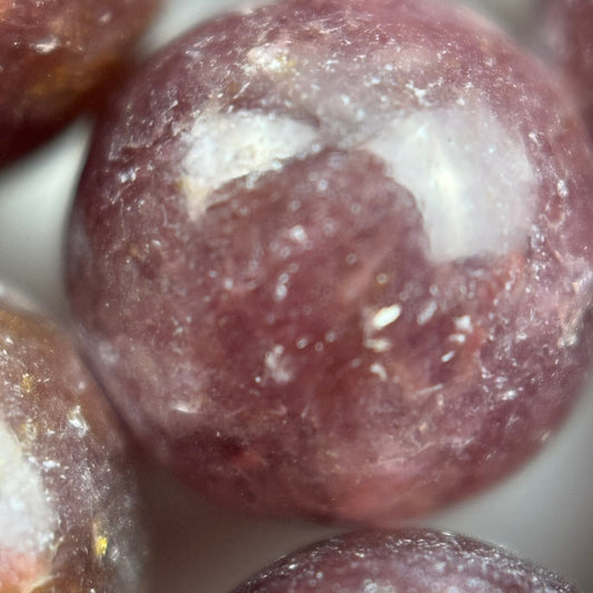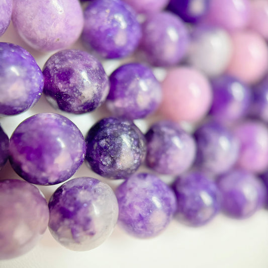 Lepidolite beads are polished spheres made from the lepidolite mineral, a lithium-rich mica known for its distinctive lavender color and glittery sheen. They are often used for crafting jewelry, but also hold a deeper value in metaphysical healing and spiritual practices.