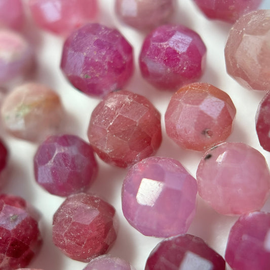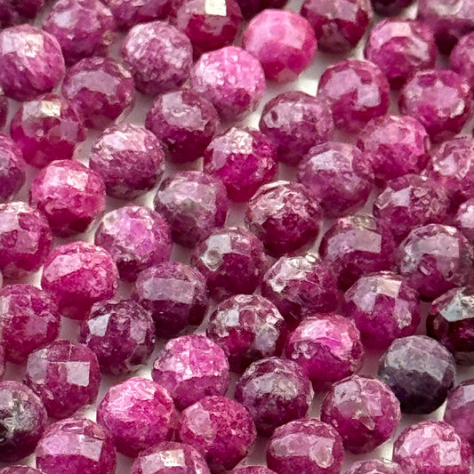 Ruby beads are cut from larger ruby crystals, shaped into rounds or faceted forms, and polished for shine and uniformity.