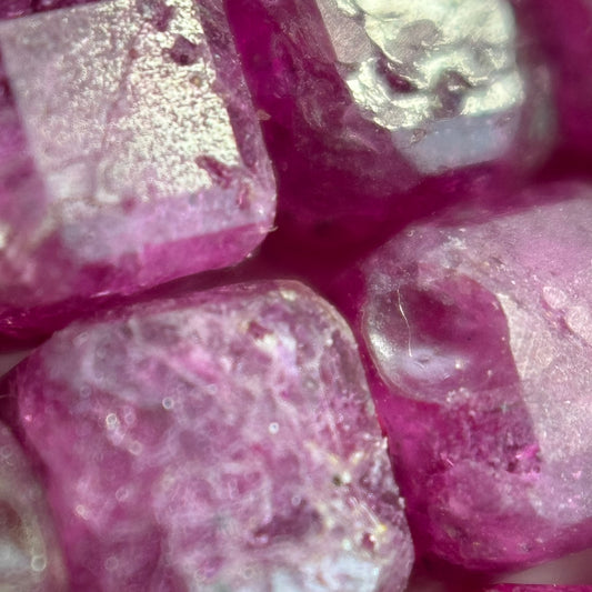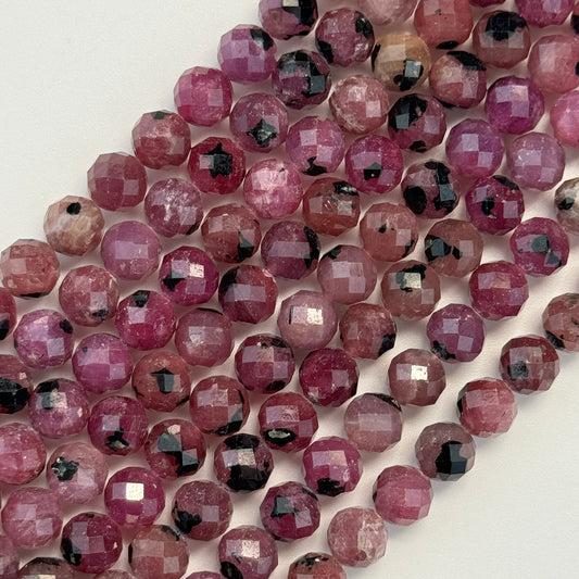 Ruby beads are cut from larger ruby crystals, shaped into rounds or faceted forms, and polished for shine and uniformity.