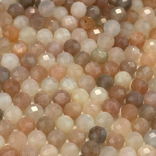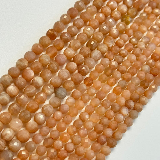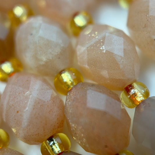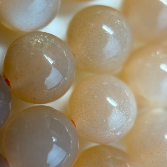Moonstone and sunstone beads are cut from larger crystals, shaped into rounds, faceted forms, or cabochons, and polished to enhance their natural optical effects and luster.