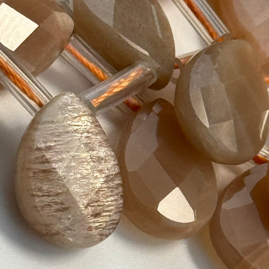 Most moonstone and sunstone beads are untreated, though some may receive surface coating for protection. Natural, untreated stones with strong optical effects are most valuable.