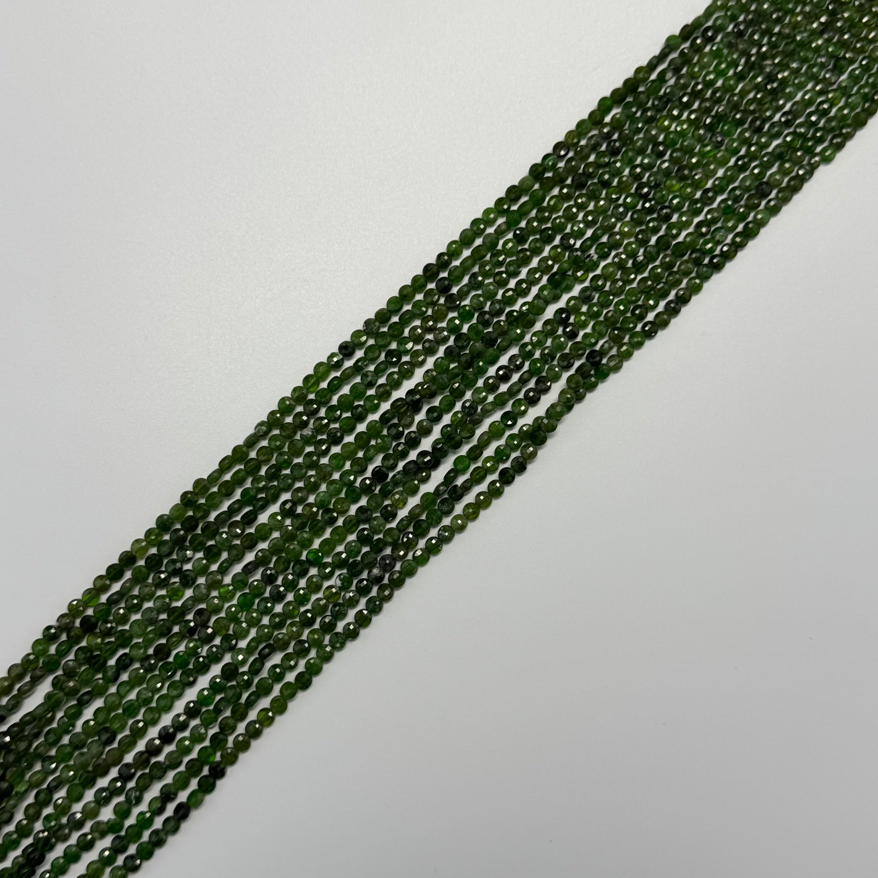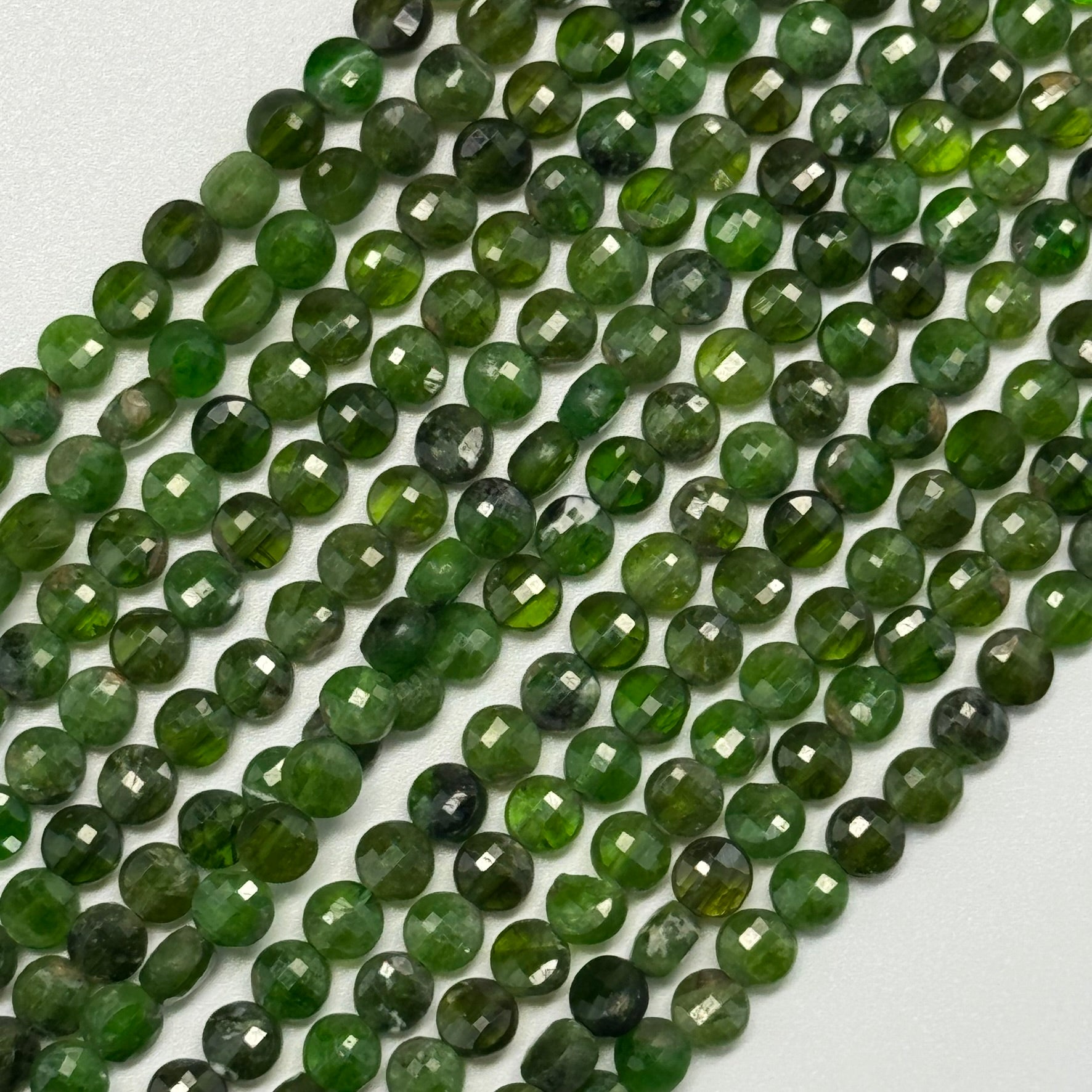 Diopside Faceted Beads - Lentil Shape: These high-quality beads are made from natural diopside gemstones that have been carefully faceted into a lentil shape to catch the light and add dimension to any jewelry design. Each bead is polished to a high shine, adding to their already impressive craftsmanship. With their unique shape and sparkling appearance, these beads are perfect for creating statement pieces or adding subtle accents to your designs. Whether you're a seasoned jewelry maker or just starting out, these beads are sure to inspire creativity and add a touch of elegance to any look. With their durability and versatility, they make an excellent addition to any jewelry collection.